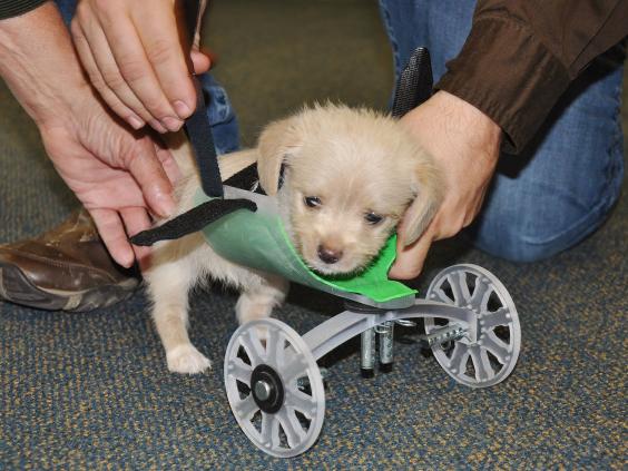 A rescue puppy with only two legs is learning how to walk with the aid of a 3D-printed wheelchair.