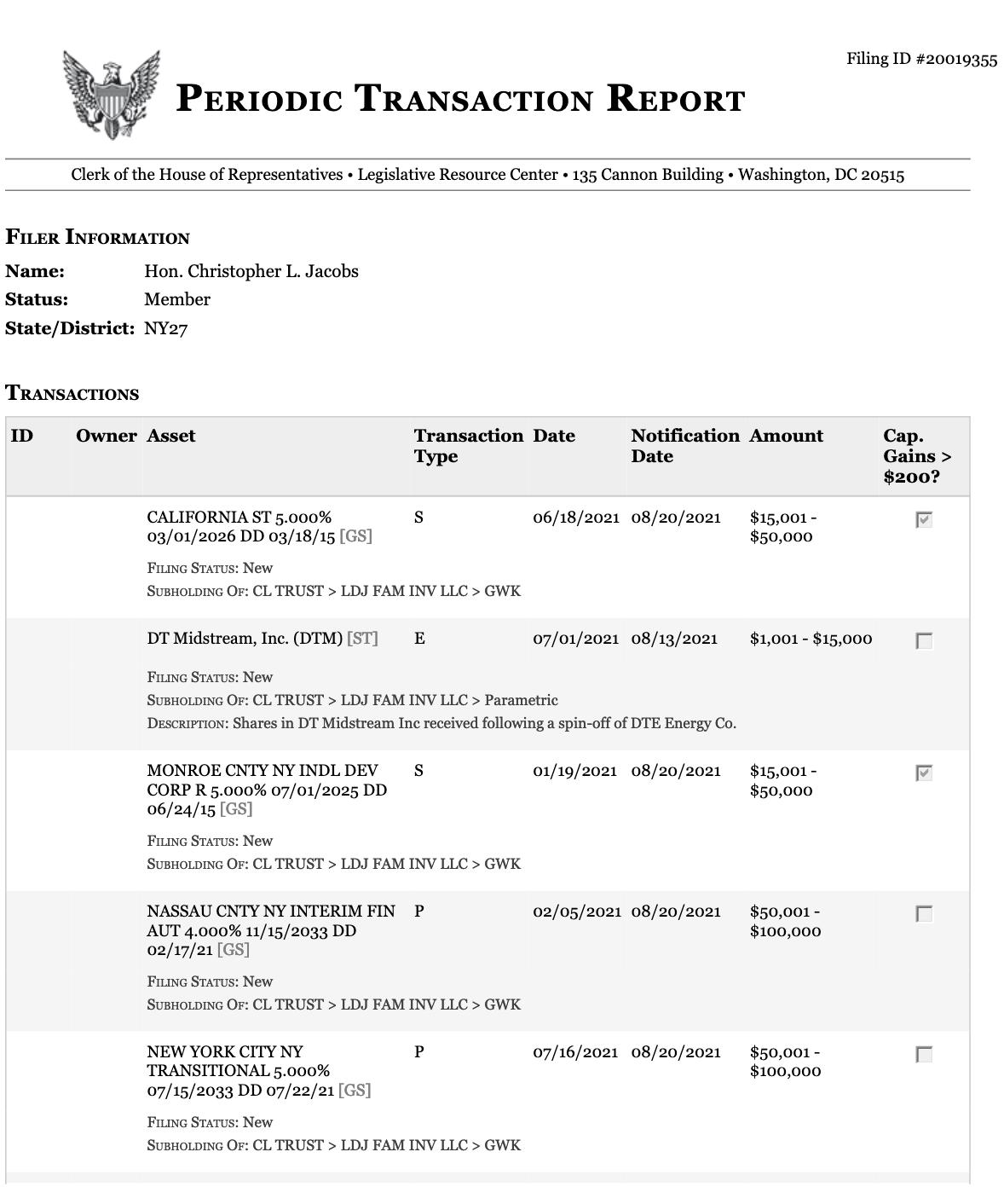 Last week, Rep. Chris Jacobs (R-N.Y.) disclosed 13 securities trades, totaling more than $356,000, that were made between Jan. 19 and July 16.