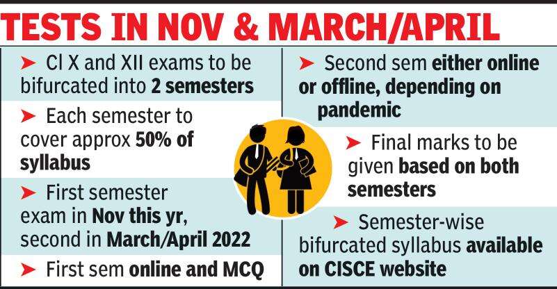 KOLKATA: The Council for the Indian School Certificate Examinations (CISCE), which conducts the ICSE (Class X) and ISC (Class XII) board examinations, on Friday announced a decision to bifurcate each of the exams into two semesters, with the first semester exams to be conducted in November this year in online mode and the second semester in March/April 2022 either online or offline, depending on the Covid numbers. Each semester would cover approximately 50% of the syllabus.