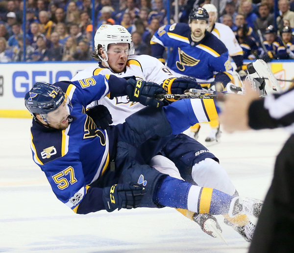 The game appeared headed to the first intermission with the Predators leading, but with 1:32 left in the first period, Vernon Fiddler initiated a knee-on-knee hit on Colton Parayko that opened the door for the Blues.