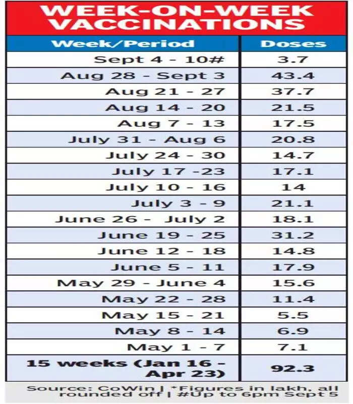 This is 15% more than the 37.7 lakh doses it administered during the week ending August 27, which was a 75.3% increase compared to the 21.5 lakh doses in the week before that.