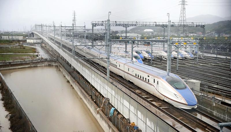 The Hokuriku Shinkansen rails and depot in Nagano were flooded after the Chikumagawa river overflowed. As many as 120 cars, or 10 bullet trains in the depot -- one third of all the Hokuriku Shinkansen trains -- were submerged, forcing East Japan Railway Co. to suspend services between Nagano and Joetsu-Myoko to inspect equipment and make recovery efforts.