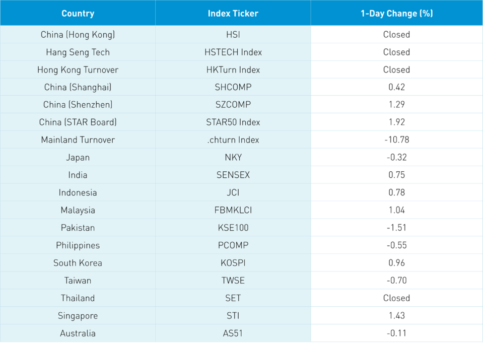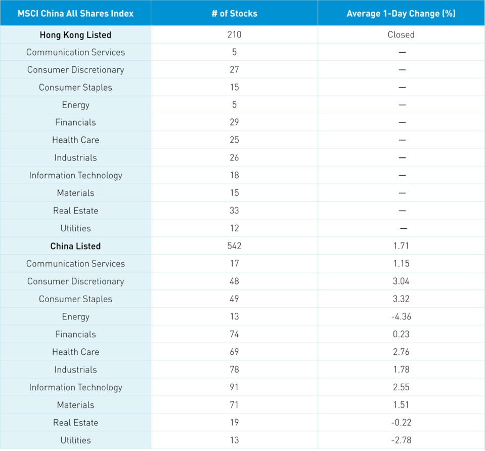 Shanghai, Shenzhen, and the STAR Board gained +0.42%, +1.29% and +1.92% as volume declined -10.78% which is 91% of the 1-year average. The 542 mainland stocks within the MSCI China All Shares gained +1.73% led by staples +3.33%, discretionary +3.05%, healthcare +2.78%, tech +2.56%, industrials +1.79% and materials +1.52% while energy -4.35% and utilities -2.77%. The mainland’s most heavily traded were Kweichow Moutai +3.15%, BYD +5.52%, Longi Green Energy +6.47%, Wuliangye Yibin +4.43%, Tianqi Lithium +3.64%, Luzhou Laojiao C +5.83%, China Northern Rare Earth +6.28%, Sungrow Power Supply +5.6%, Ganfeng Lithium +6.06% and Tongwei +4.12%. Northbound Stock Connect was closed today.