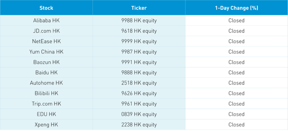 Mainland equities opened lower but grinded higher to close in positive territory. Growth stocks ended higher while energy and utilities were lower. Mainland volumes were a touch weak as we would prefer to see a strong day like today on strong volumes. Northbound Stock Connect, which accounts for approximately 5% of Mainland turnover, was closed due to Hong Kong’s closure.