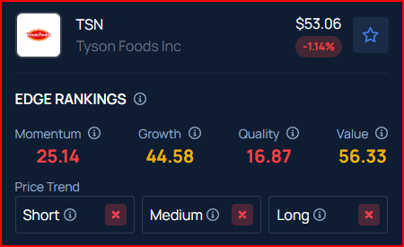 Benzinga's Edge Rankings place Tyson Foods in the 16th percentile for quality and the 44th percentile for growth, reflecting average performance. Check the detailed report here.