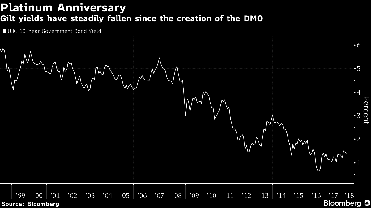 It’s been 20 years since Britain’s debt issuing office was founded, when U.K. yields were 6 percent. Geopolitical risks and interest-rate rises are now the main risks to keeping the country’s borrowing costs low, according to its chief.