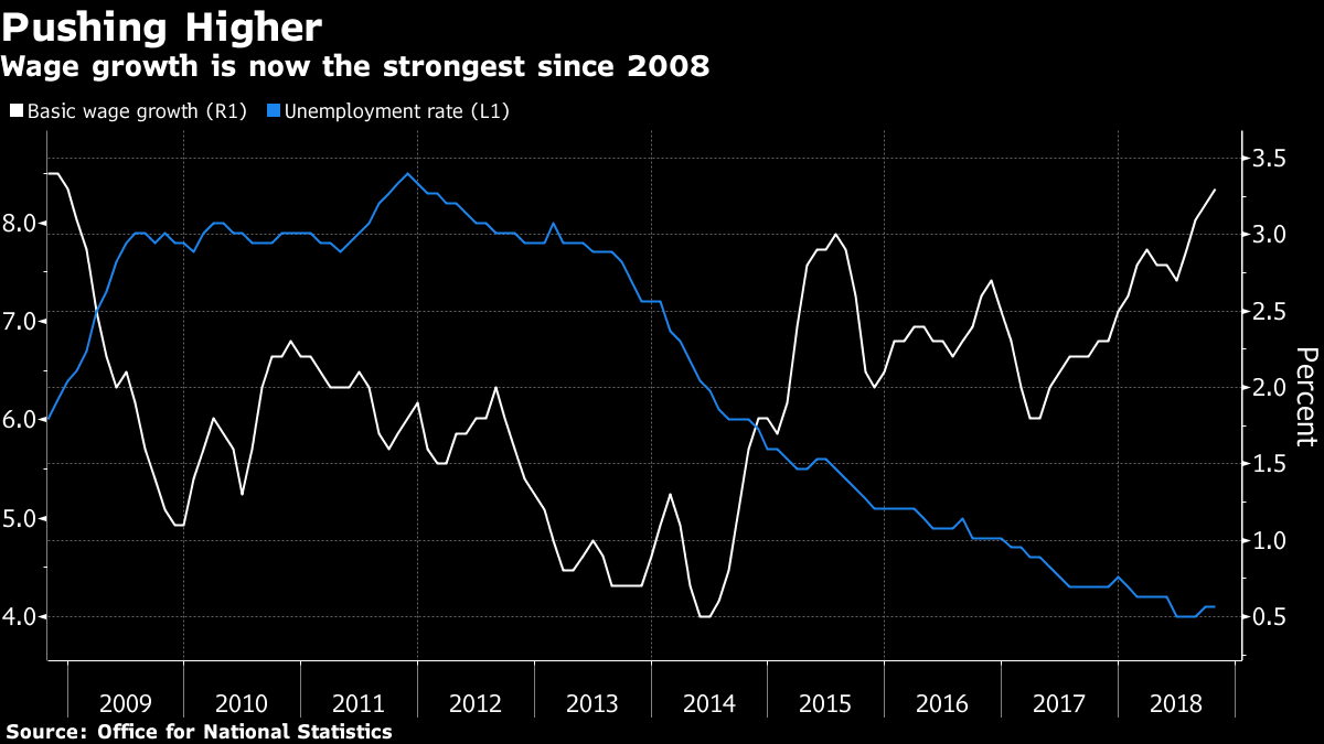 Basic wage growth accelerated to a near 10-year high between August and October and unemployment was just shy of its lowest rate since 1975, the Office for National Statistics said.