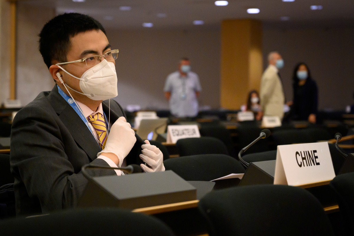 A Chinese delegate, wearing a protective face mask, attends the resuming of a United Nations Human Rights Council session before an urgent debate on allegations of "systemic racism, police brutality and violence against peaceful protests" in the United States following the death of George Floyd druing the coronavirus pandemic (COVID-19) outbreak in Geneva, Switzerland, June 15, 2020 Fabrice Coffrini/Pool via REUTERS