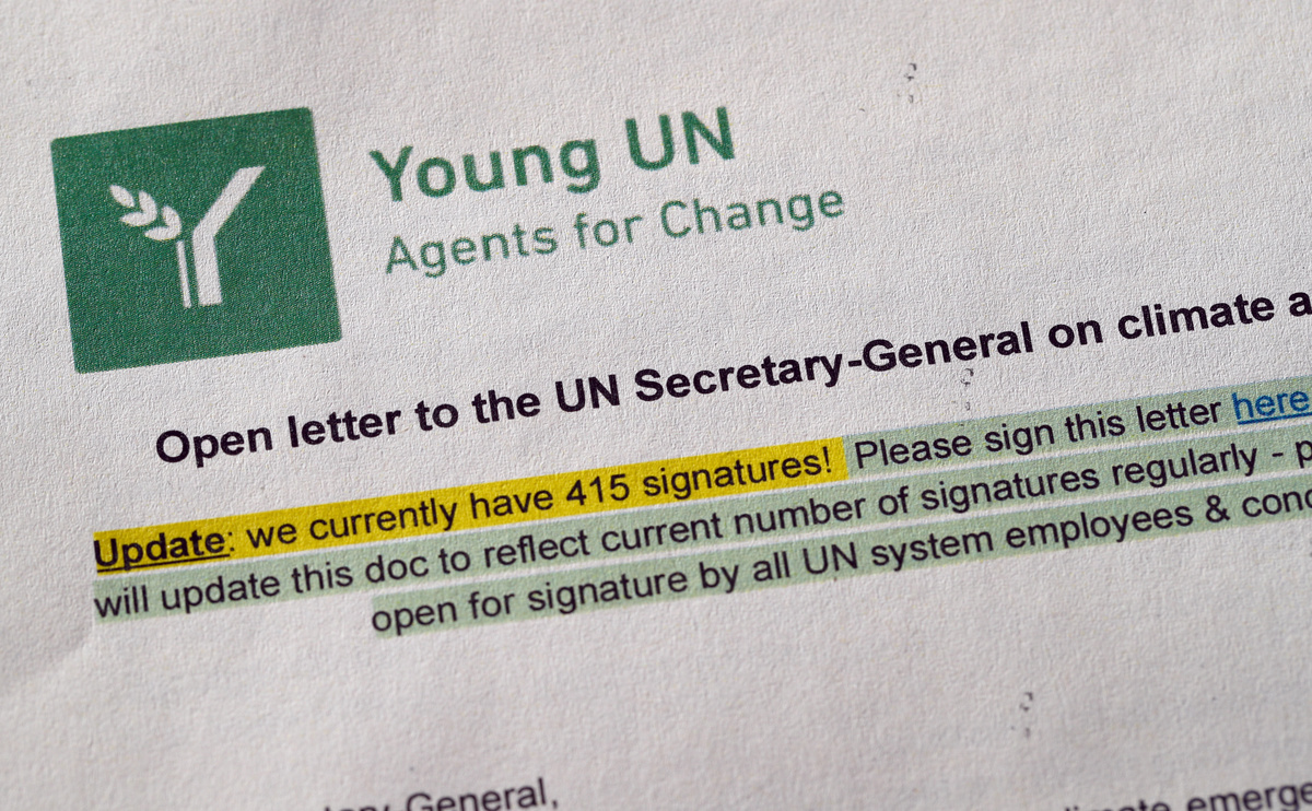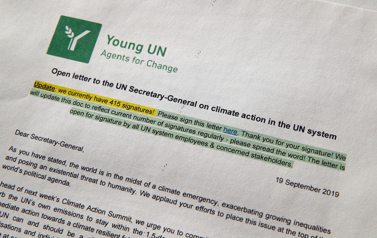 "Our commitments need to be more ambitious and at least as concrete as those of the UN Member States and non-party stakeholders attending the UN Climate Action Summit," said the letter, signed by at least 1,950 employees. It was organized by a group called Young UN, an internal network committed to ensuring the organization embodies the principles it stands for.