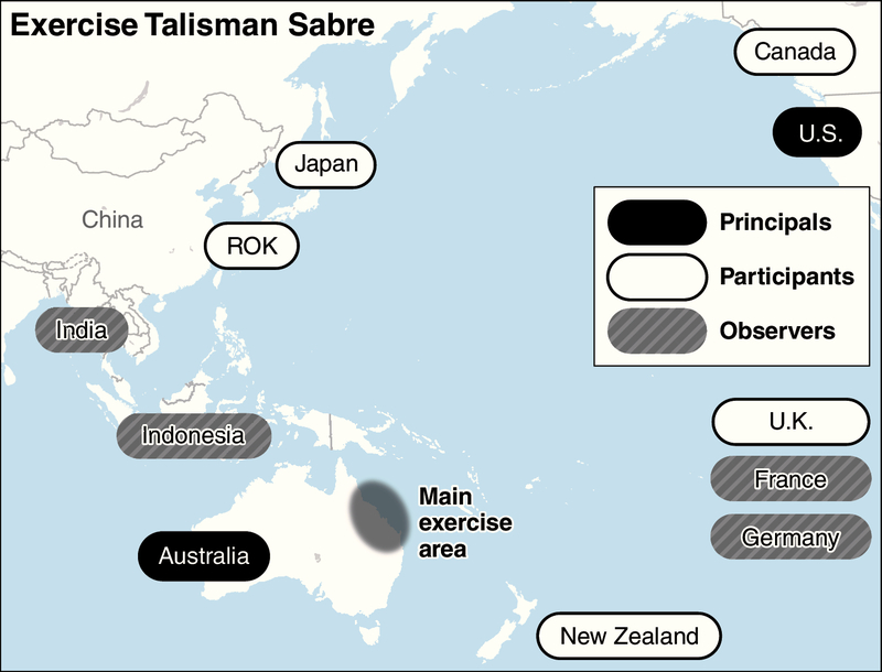 JAKARTA -- Australian and U.S. forces began their joint exercise Talisman Sabre in Australia and surrounding waters Wednesday, with an eye on expanding the alliance for keeping China in check.