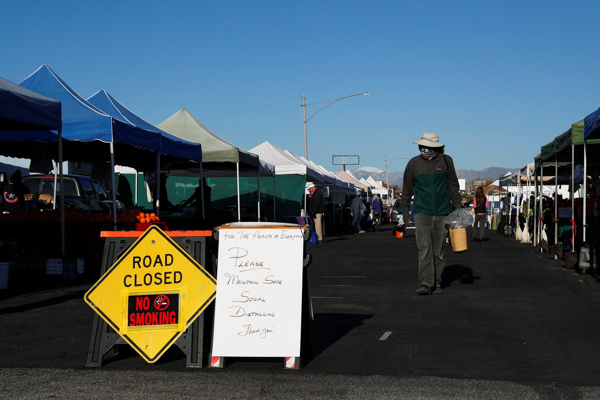 A man wearing a face mask carries vegetables at the Joshua Tree Certified Farmers' Market amid an outbreak of the coronavirus disease (COVID-19), in Joshua Tree, California, U.S., April 4, 2020. REUTERS/Shannon Stapleton