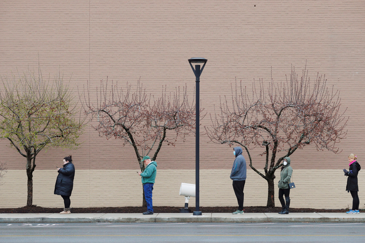 People line up at a safe social distance outside the grocery store amid the coronavirus disease (COVID-19) outbreak in Medford, Massachusetts, U.S., April 4, 2020. REUTERS/Brian Snyder