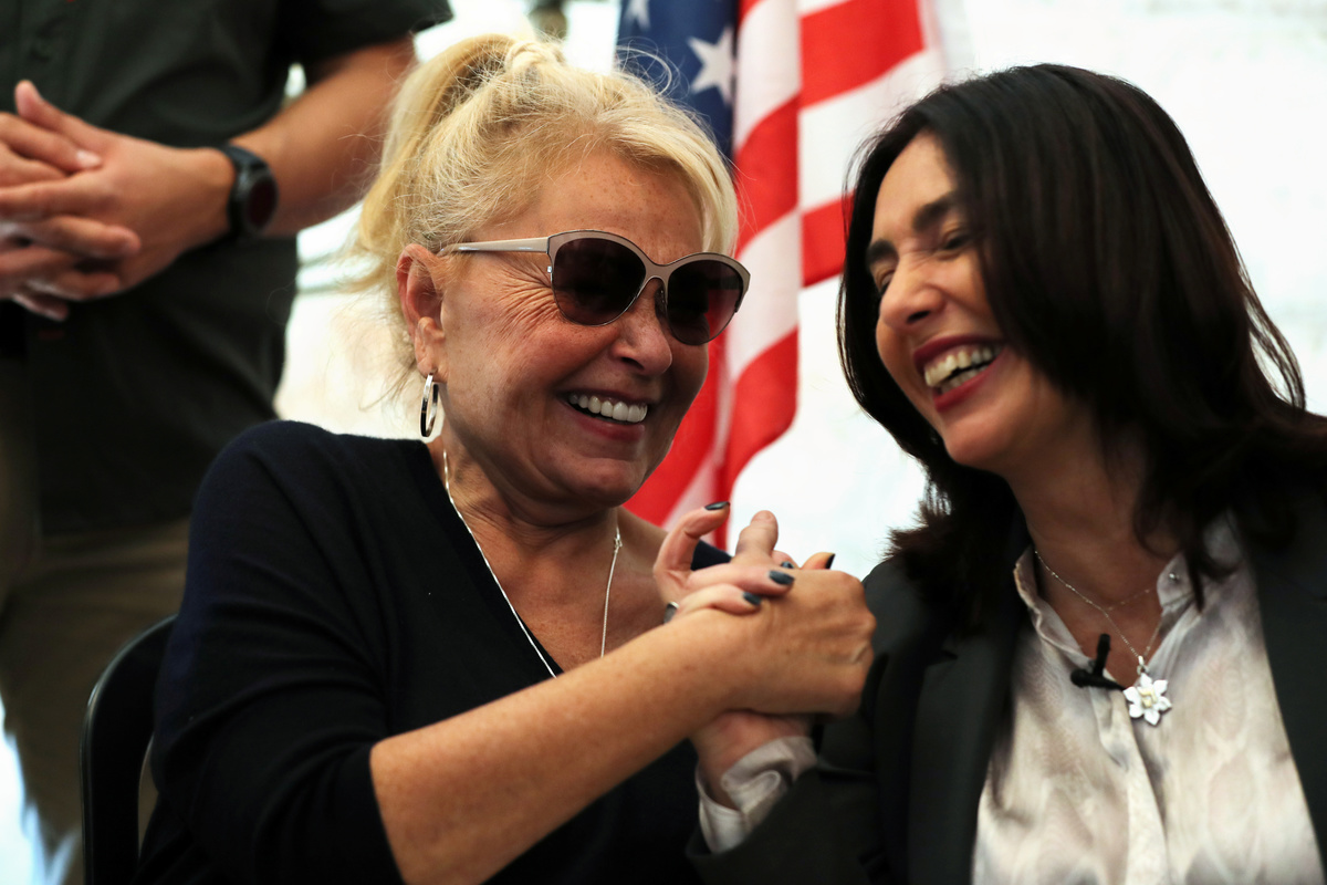 American comedian, Roseanne Barr, laughs as she holds hands with Israel's Minister of Culture and Sport, Miri Regev, during their meeting in Jerusalem's Old City January 27, 2019. REUTERS/Ammar Awad