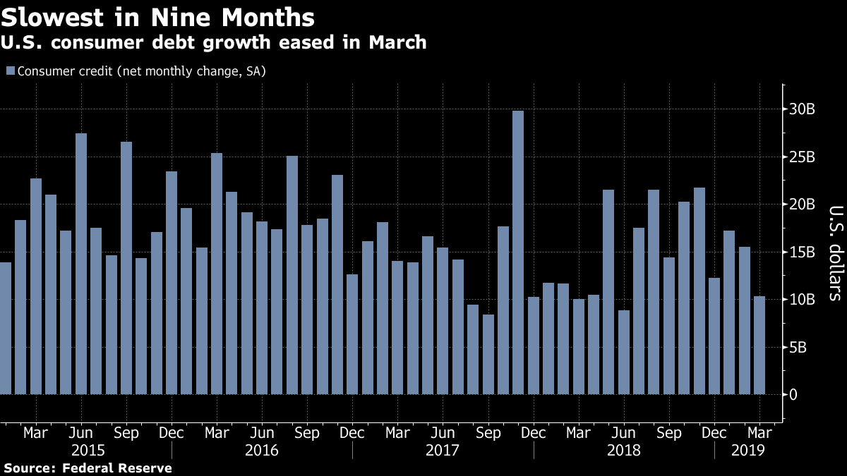U.S. consumer debt growth eased in March with the smallest increase in nine months, suggesting Americans were less motivated to spend despite the strong labor market.