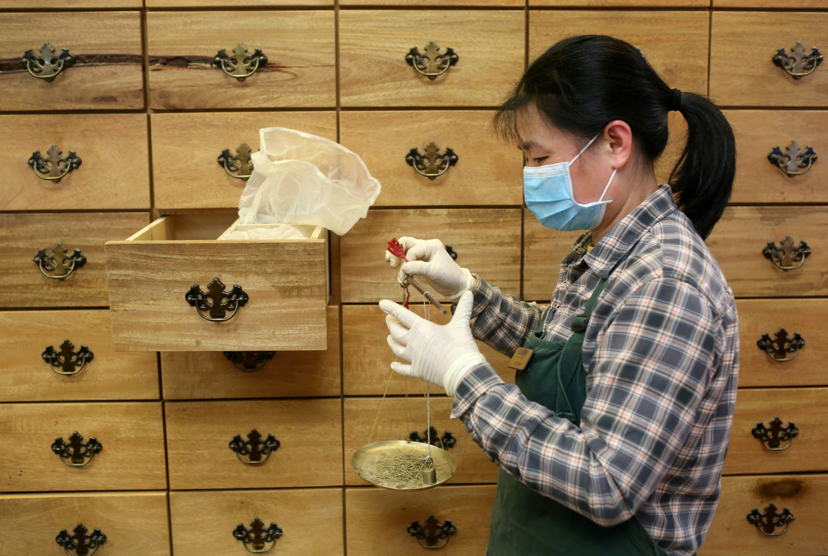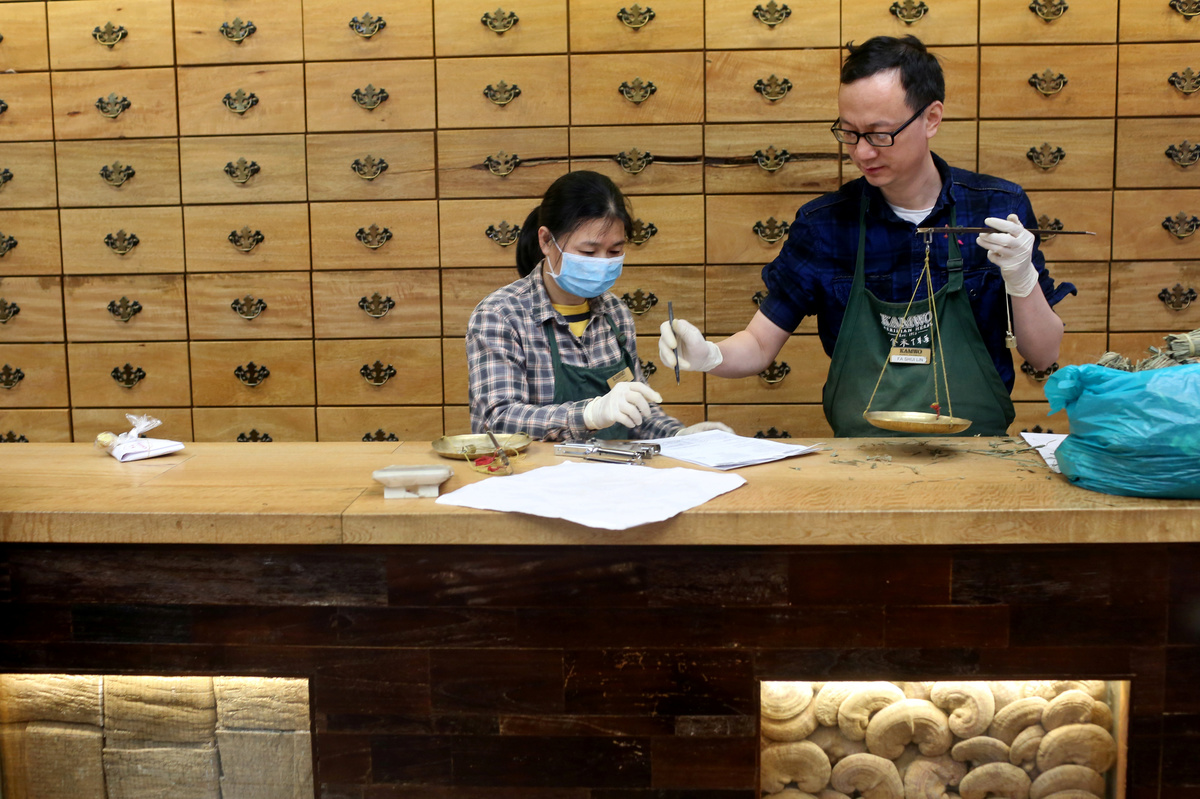 On a recent afternoon, the store was bustling with activity as the delicate scent of medicinal herbs wafted through the air. Against the backdrop of an imposing apothecary cabinet, workers loaded herbs onto old-fashioned weighing scales as customers placed orders for formulas that include honeysuckle, cinnamon twig, peony root and other substances.