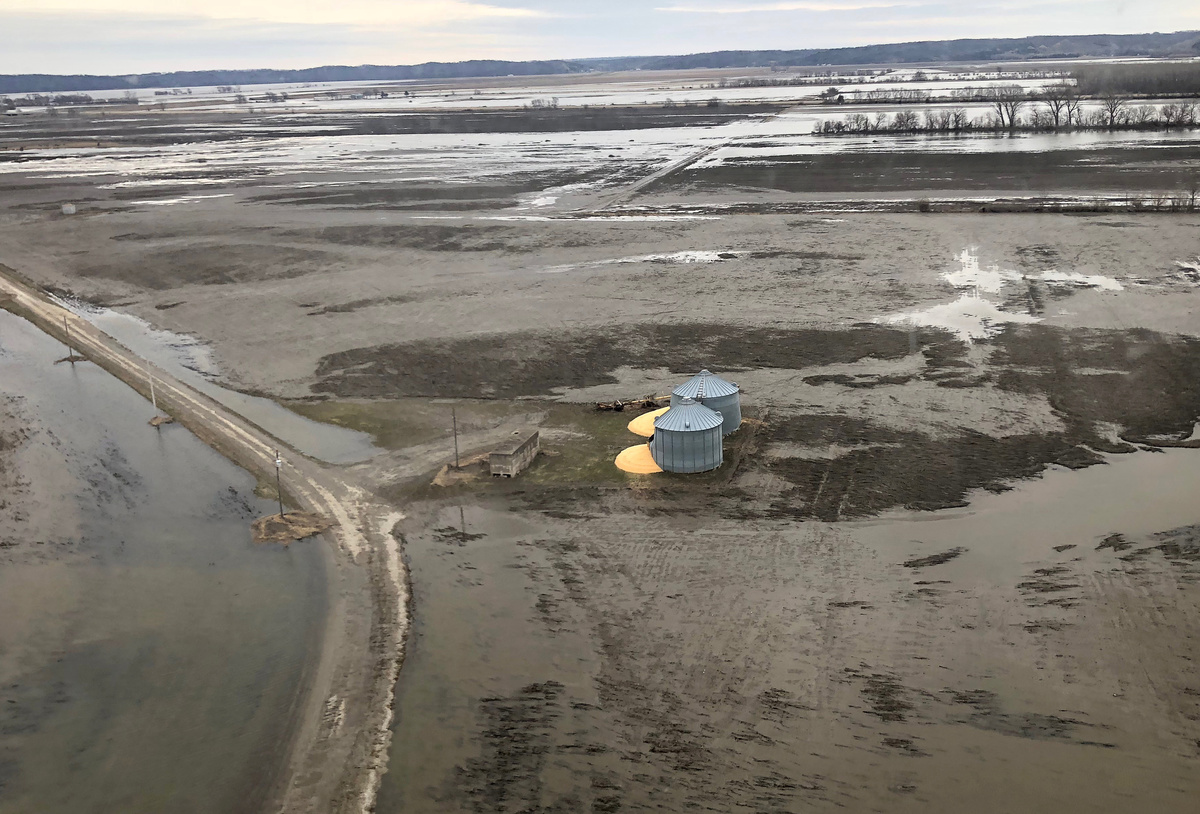 MALVERN, Iowa (Reuters) - The Black Hawk military helicopter flew over Iowa, giving a senior U.S. agriculture official and U.S. senator an eyeful of the flood damage below, where yellow corn from ruptured metal silos spilled out into the muddy water.