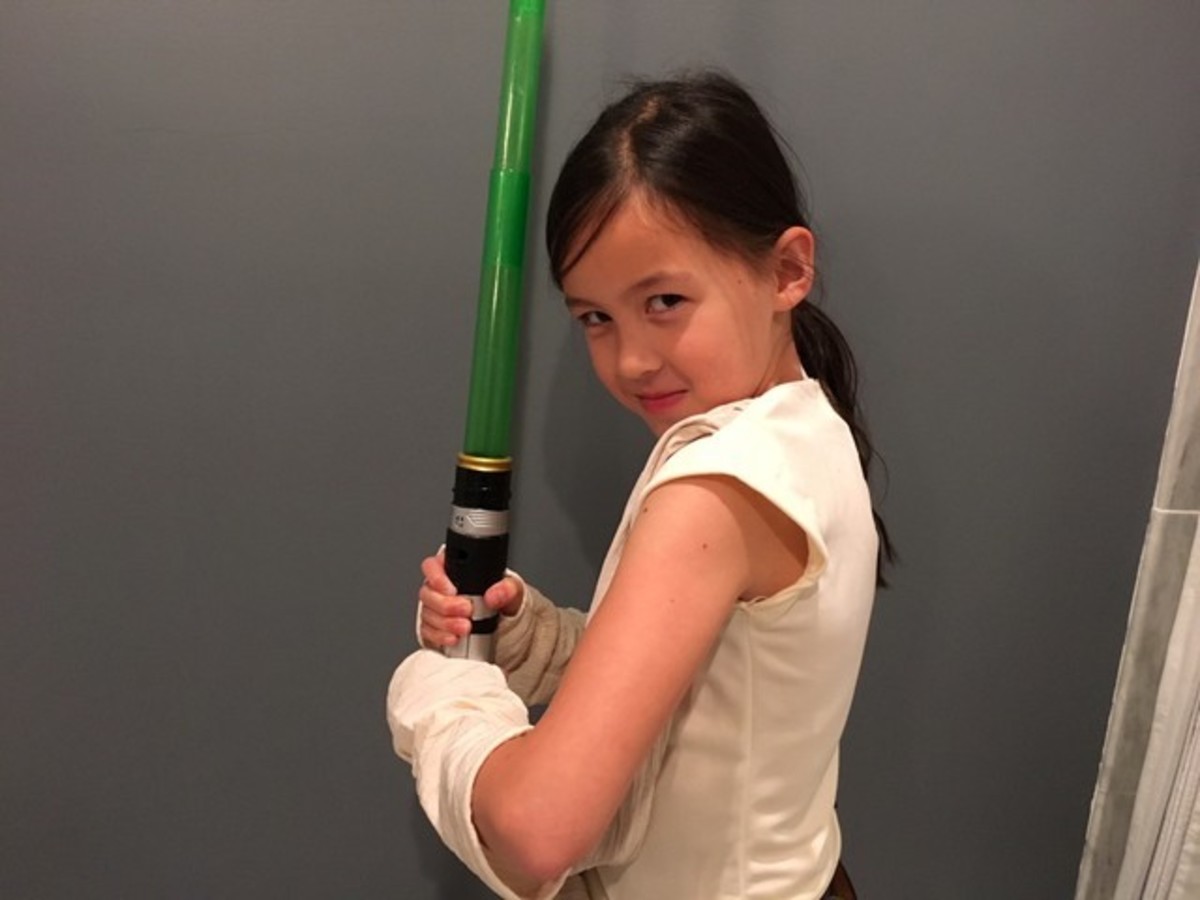 Raising her light saber, 9-year-old Abby of Maplewood, New Jersey, demonstrated her warrior stance dressed as Rey, a steel-colored cloth crossed over her chest, with pants to match her tunic.