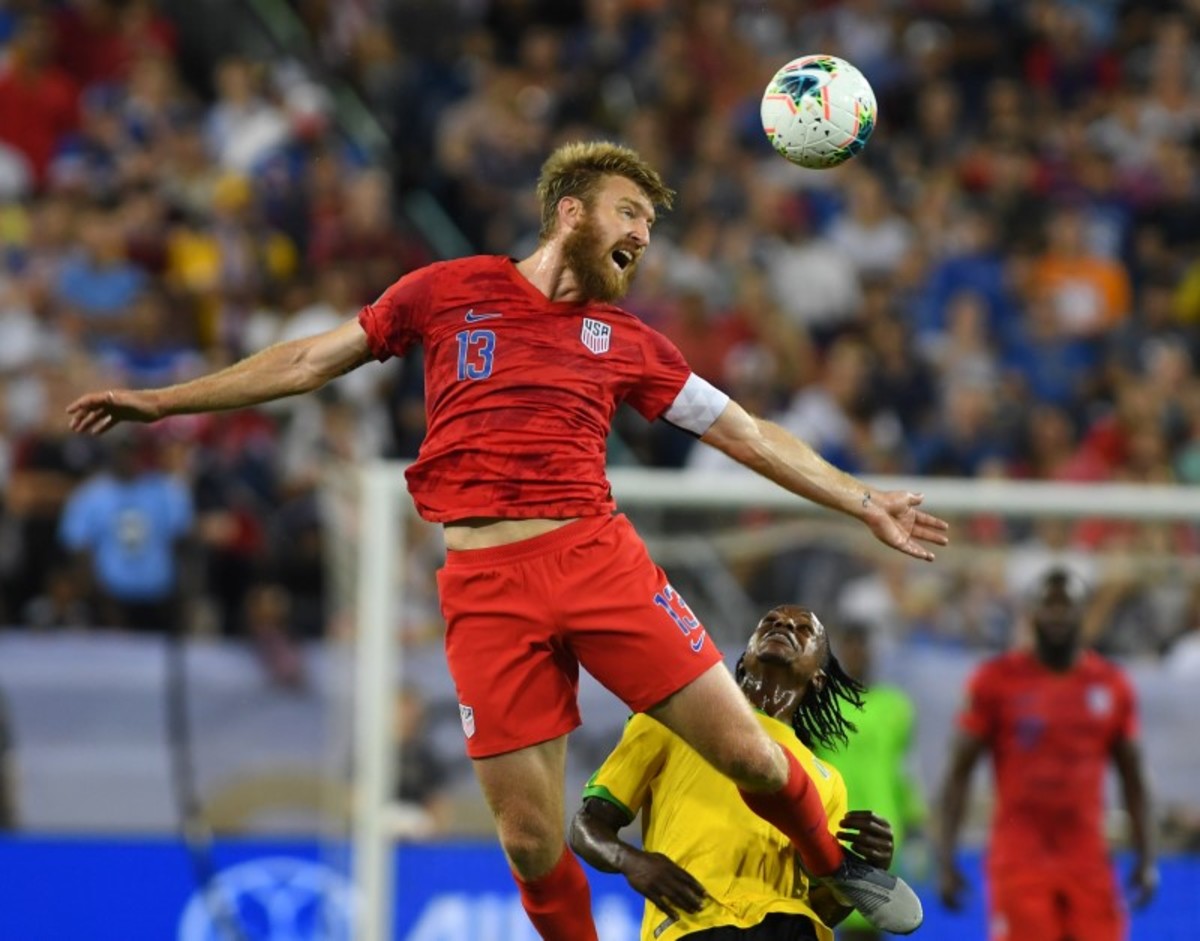 Jul 3, 2019; Nashville, TN, USA; United States defender Tim Ream (13) heads the ball in the first half against Jamaica during semi-final play in the CONCACAF Gold Cup soccer tournament at Nissan Stadium. Mandatory Credit: Christopher Hanewinckel-USA TODAY Sports