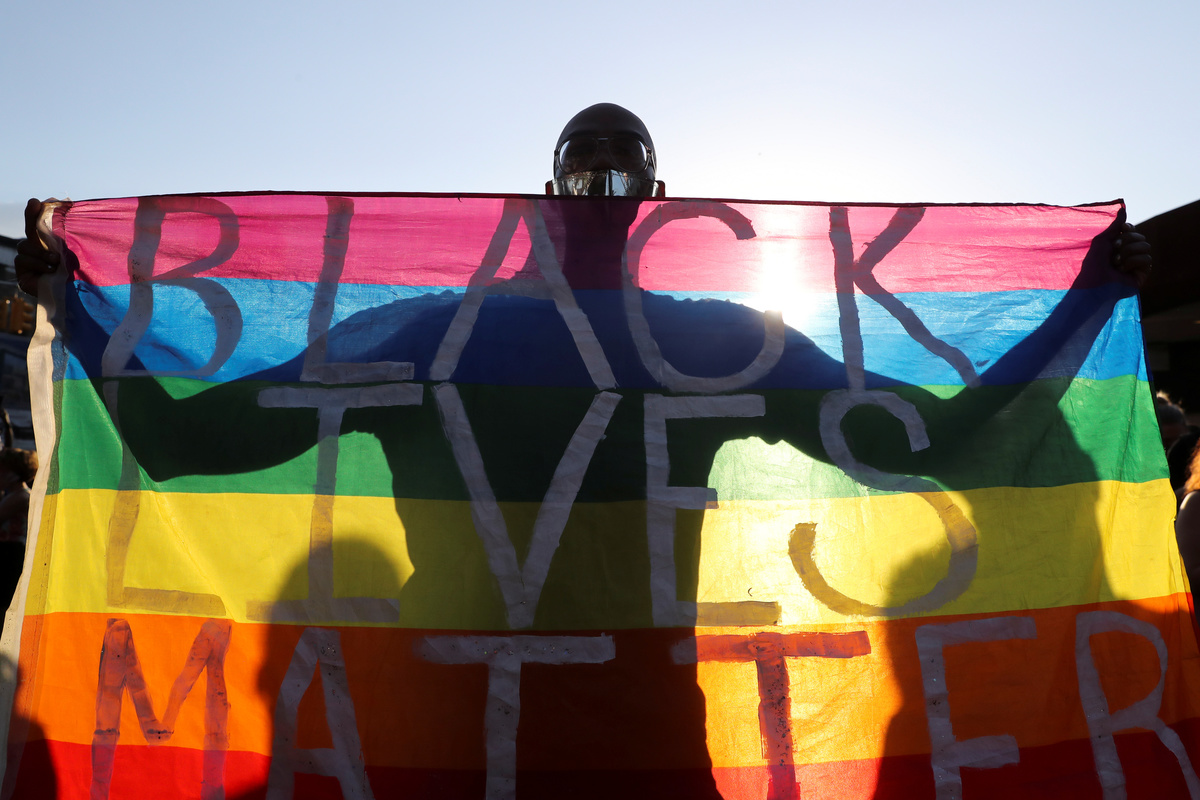 A person holding an LGTB flag reading "Black Live Matter" participates in a protest against racial inequality in the aftermath of the death in Minneapolis police custody of George Floyd, in Brooklyn, New York, U.S. June 6, 2020. REUTERS/Jeenah Moon