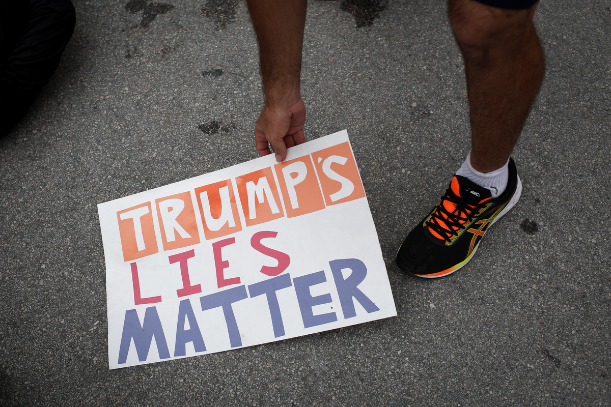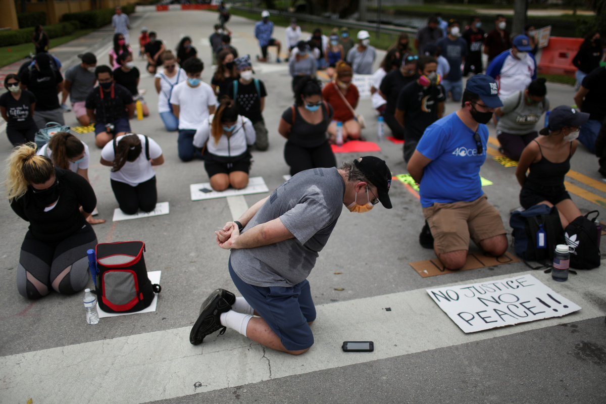 Demonstrators kneel as they take part in a protest against racial inequality in the aftermath of the death in Minneapolis police custody of George Floyd, outside Trump National Doral golf resort in Doral, Florida, U.S., June 6, 2020. REUTERS/Marco Bello