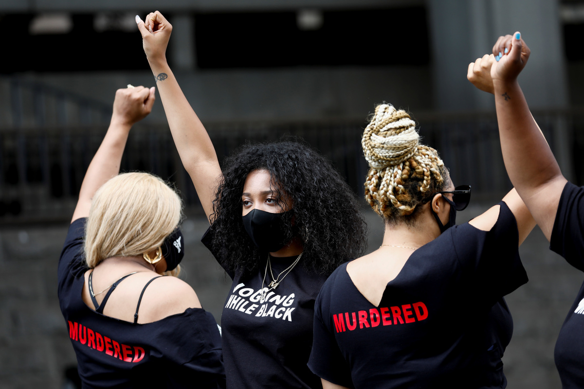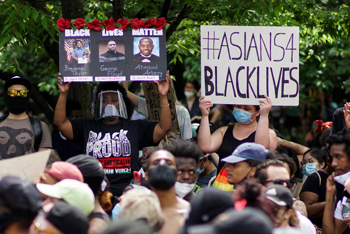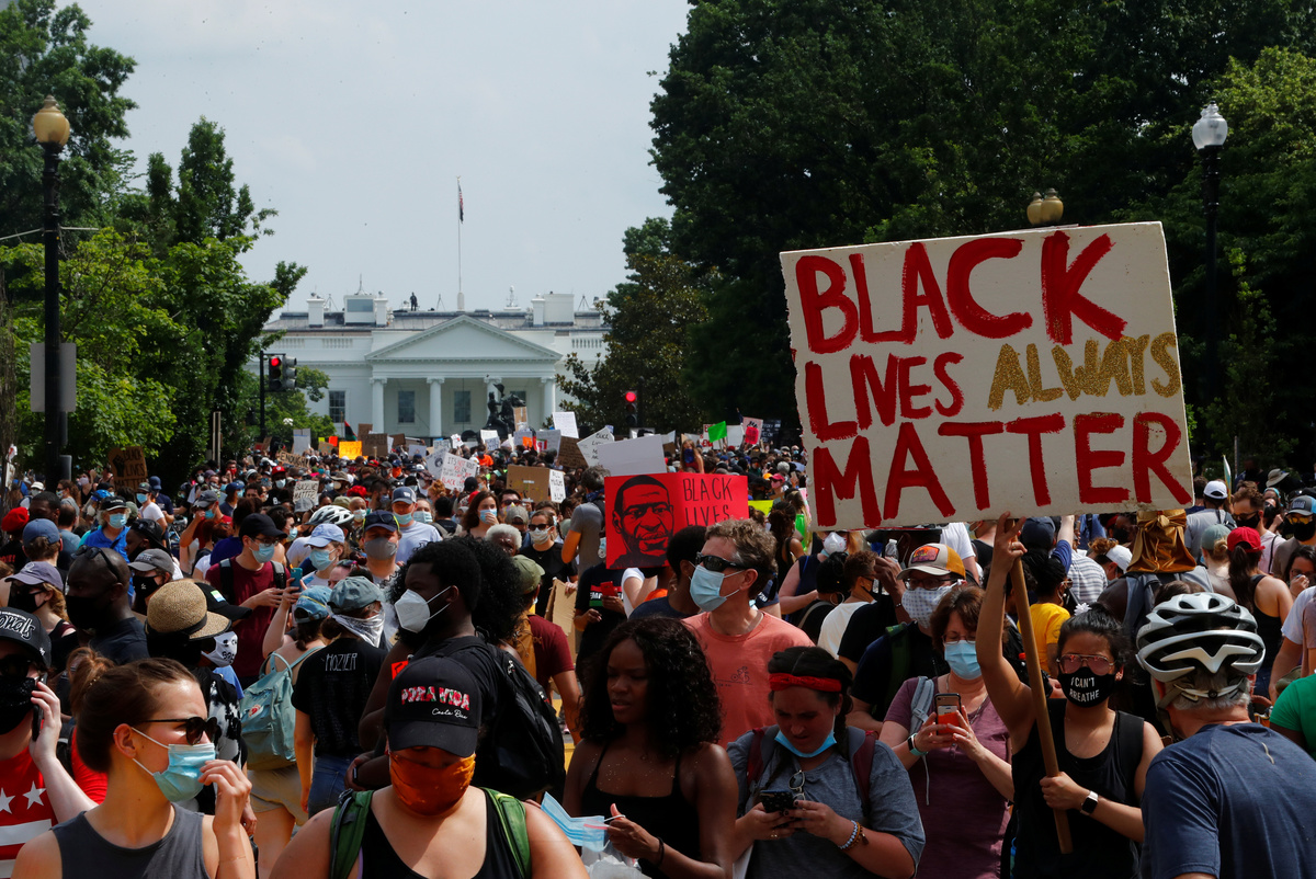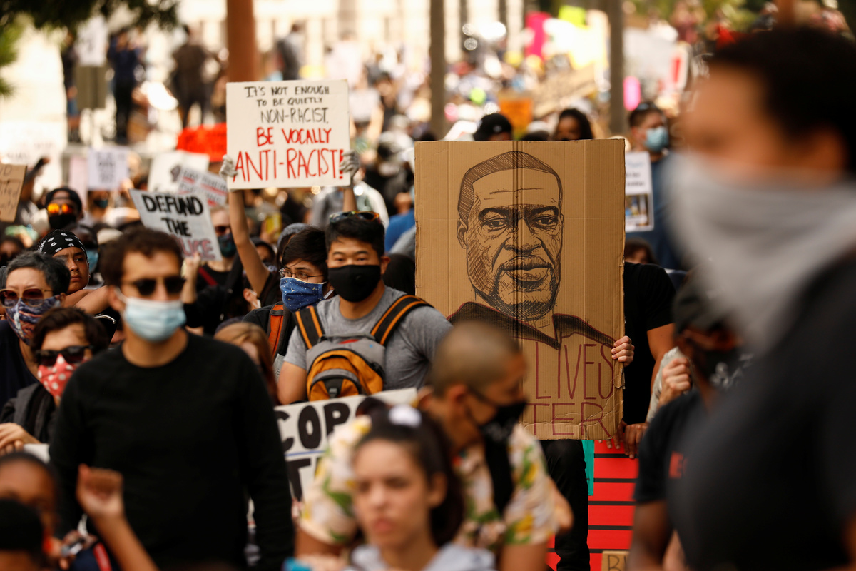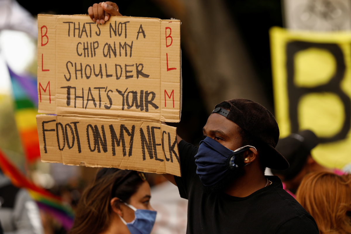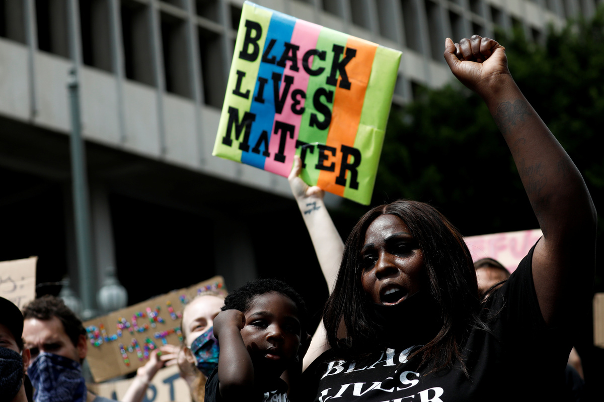 A woman holds a banner as she participates in a protest against racial inequality in the aftermath of the death in Minneapolis police custody of George Floyd, in Brooklyn, New York, U.S. June 6, 2020. REUTERS/Jeenah MoonWomen raise a fist during a protest against racial inequality in the aftermath of the death in Minneapolis police custody of George Floyd in Los Angeles, California, U.S. June 6, 2020. REUTERS/Patrick T. FallonA demonstrator picks up a placard from the floor as he takes part in a protest against racial inequality in the aftermath of the death in Minneapolis police custody of George Floyd, outside Trump National Doral golf resort in Doral, Florida, U.S., June 6, 2020. REUTERS/Marco BelloDemonstrators take part in a protest against the death in Minneapolis police custody of George Floyd, in New York City, New York, U.S., June 6, 2020. REUTERS/Eduardo MunozFaith Rose Williams, 4, holds a juice box while chanting black support into a loud speaker from a stroller during a protest outside of City Hall against racial inequality in the aftermath of the death in Minneapolis police custody of George Floyd in Los Angeles, California, U.S. on June 6, 2020. REUTERS/Patrick T. Fallon A man wearing a protective face mask holds up a sign during a protest outside of City Hall against racial inequality in the aftermath of the death in Minneapolis police custody of George Floyd in Los Angeles, California, U.S. on June 6, 2020. REUTERS/Patrick T. FallonPeople attend a protest against racial inequality in the aftermath of the death in Minneapolis police custody of George Floyd in San Pedro, Los Angeles, U.S., June 6, 2020. REUTERS/Patrick T. FallonChalk written messages are seen on a street during a protest against racial inequality in the aftermath of the death in Minneapolis police custody of George Floyd, near the White House in Washington, U.S. June 6, 2020. REUTERS/Eric ThayerMichael D'Angelo holds a painting of Fred Brown, who was shot and killed by police in Nevada, at the Black?Lives?Matter?Plaza during a protest against racial inequality in the aftermath of the death in Minneapolis police custody of George Floyd, in Washington, U.S. June 6, 2020. REUTERS/Jonathan ErnstRaena Williams raises a fist as she carries her son, Reese Emeer Williams, 2, during a protest outside of City Hall against racial inequality in the aftermath of the death in Minneapolis police custody of George Floyd in Los Angeles, California, U.S. on June 6, 2020. REUTERS/Patrick T. Fallon?Demonstrators gather in front of the White House during a protest against racial inequality in the aftermath of the death in Minneapolis police custody of George Floyd, in Washington, U.S. June 6, 2020. REUTERS/Jim BourgA family member of George Floyd raises a fist as she arrives for his memorial in the town where he was born, in Raeford, North Carolina, U.S. June 6, 2020. REUTERS/Jonathan Drake