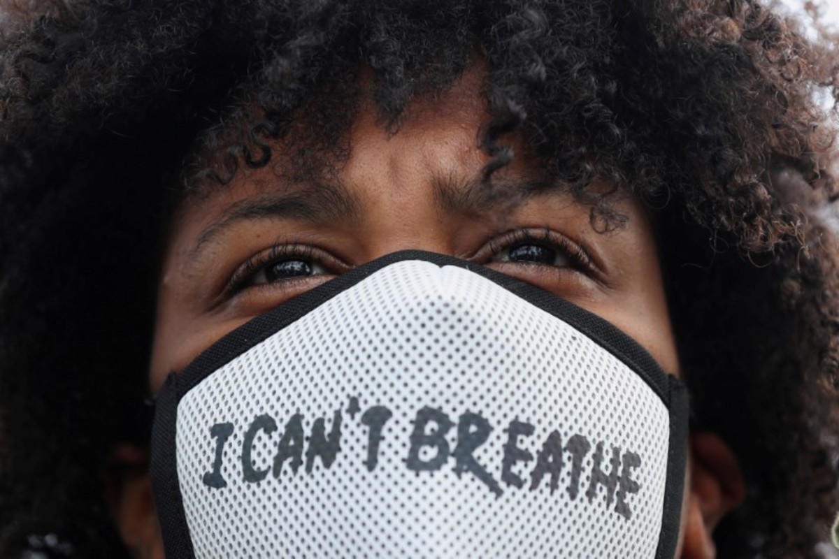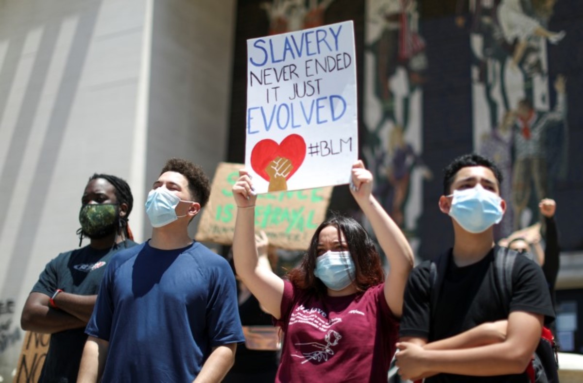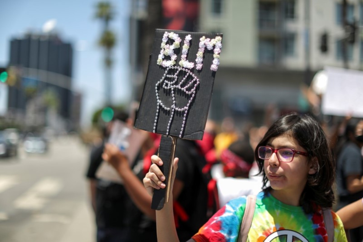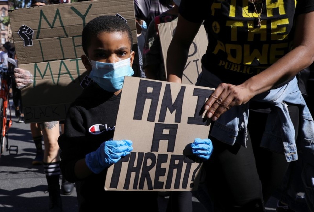 A kid wearing a face mask and protective gloves holds a sign during a protest against the death in Minneapolis police custody of George Floyd, in Brooklyn, New York City, U.S., June 3, 2020. REUTERS/Caitlin Ochs