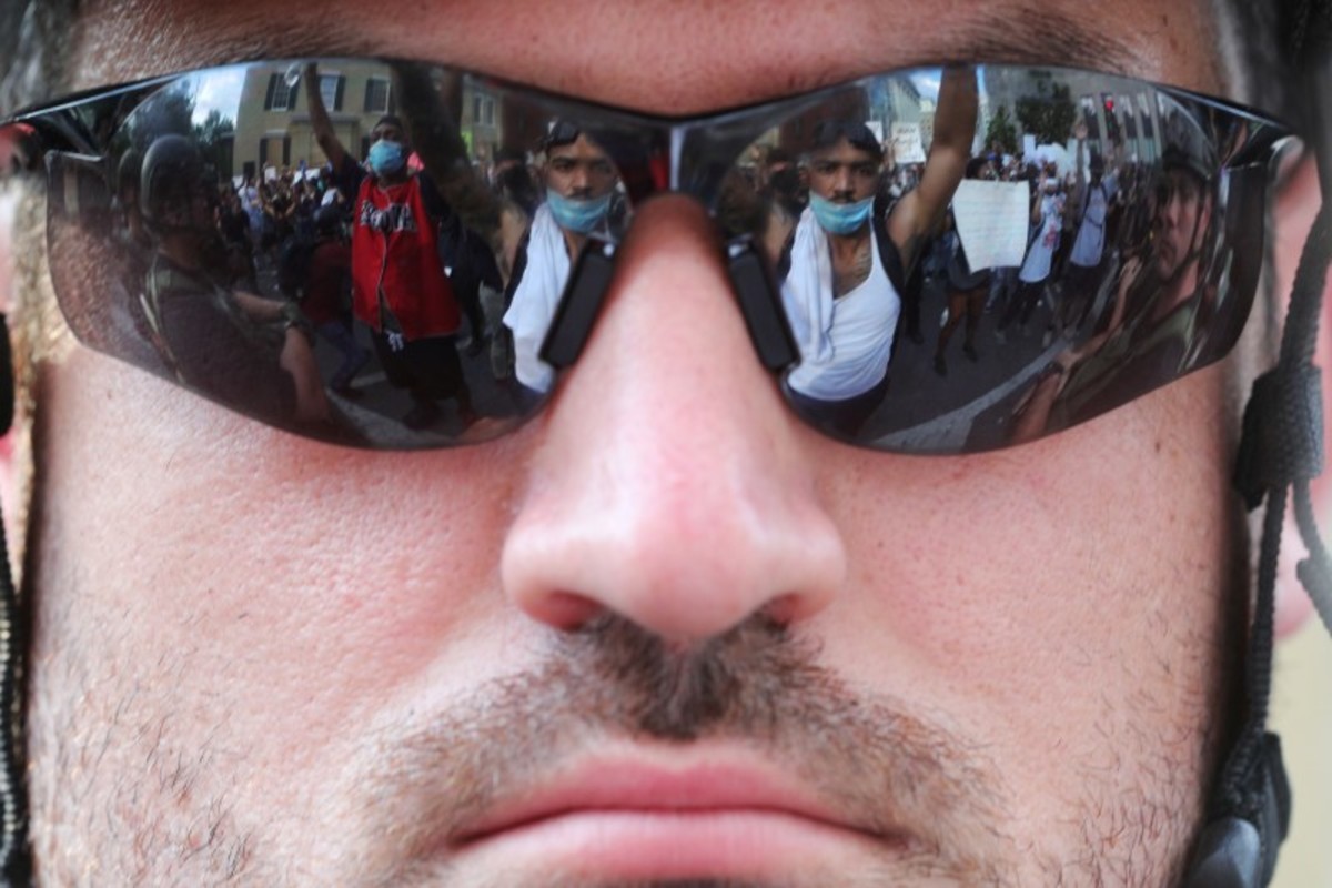 Protesters are seen reflected in the glasses of a law enforcement personnel during a rally against the death in Minneapolis police custody of George Floyd, near the White House in Washington, U.S., June 3, 2020. REUTERS/Tom Brenner