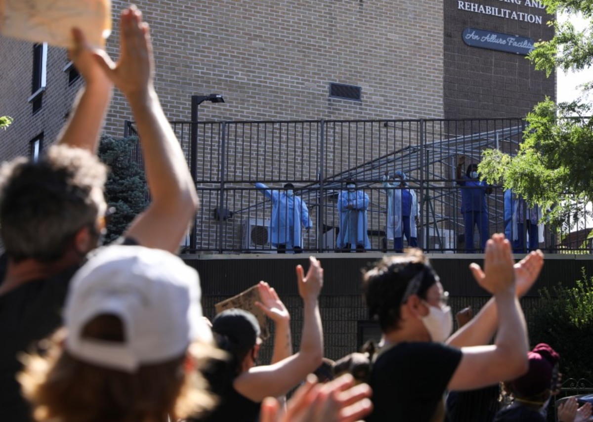 Medical workers gesture towards demonstrators during a protest against the death in Minneapolis police custody of George Floyd, in Brooklyn, New York City, U.S., June 3, 2020. REUTERS/Caitlin Ochs