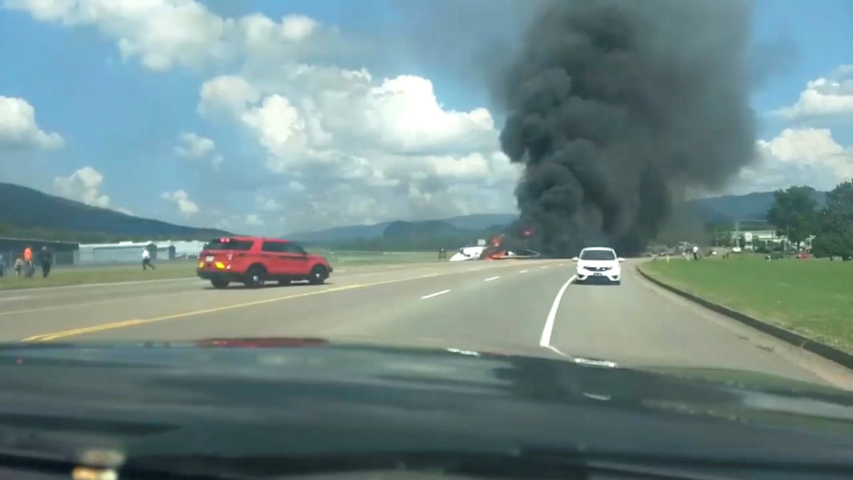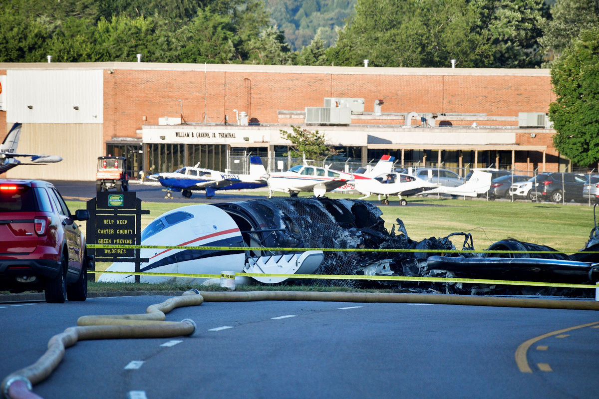 The Federal Aviation Administration said the plane rolled off the end of a runway at Elizabethton Municipal Airport at 3:40 p.m. (2040 GMT) and caught fire. The National Transportation Safety Board was also investigating.