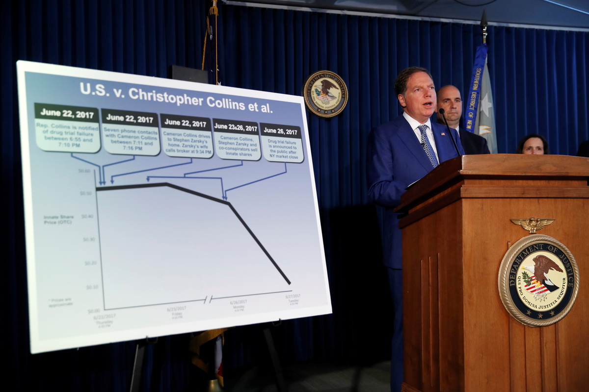 Prosecutors said that in June 2017, while attending the congressional picnic at the White House, Collins learned in an email from Innate's chief executive that a trial for its proposed secondary multiple sclerosis drug MIS416 had failed.