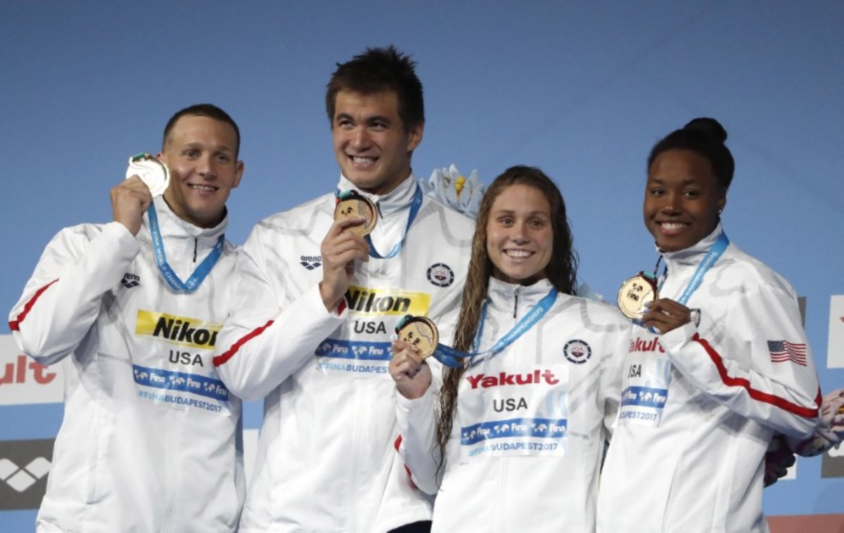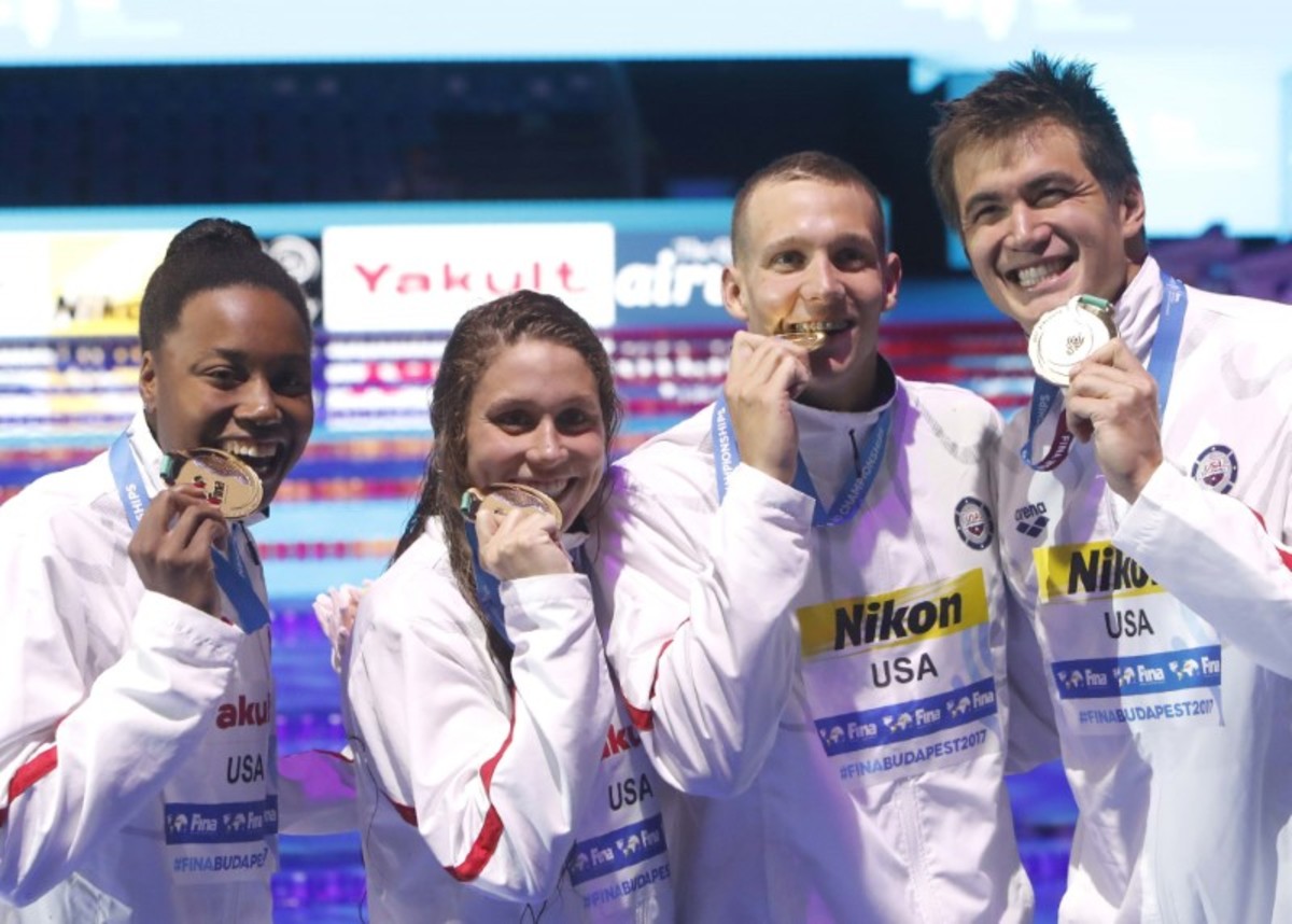 Swimming – 17th FINA World Aquatics Championships – Mixed 4x100m Freestyle awarding ceremony – Budapest, Hungary – July 29, 2017 – Caeleb Remel Dressel, Nathan Adrian, Mallory Comerford, Simone Manuel of the U.S. (gold) pose with medals. REUTERS/Bernadett Szabo