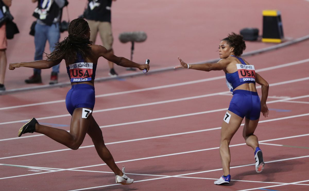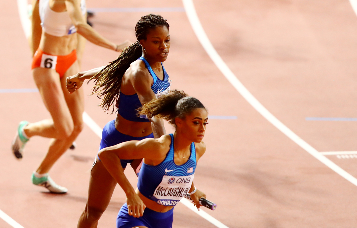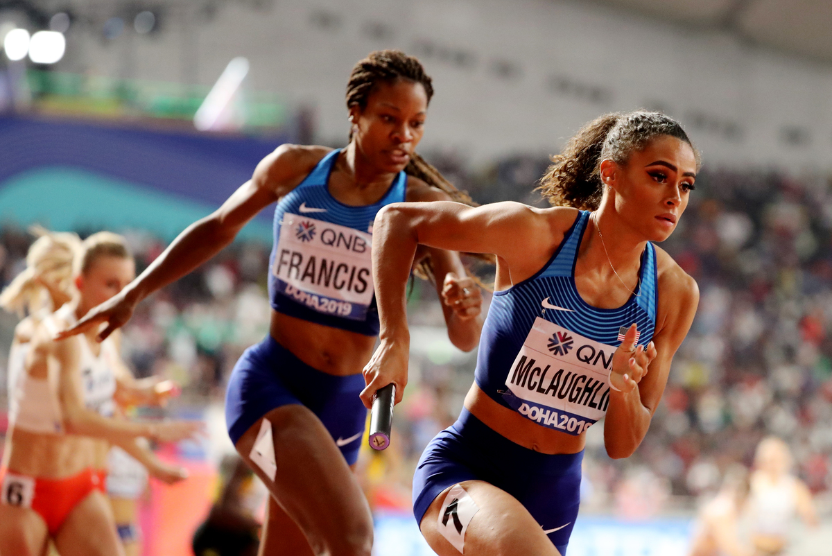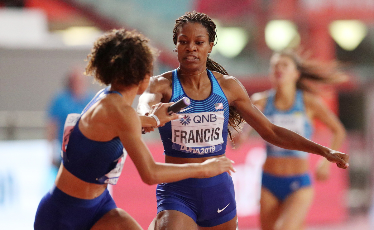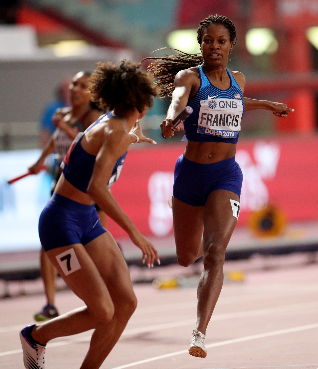 U.S. Olympic champion relay runner Phyllis Francis opened a comfortable lead before passing the baton to Sydney McLaughlin, silver medallist in the 400m hurdles at the worlds in Doha.