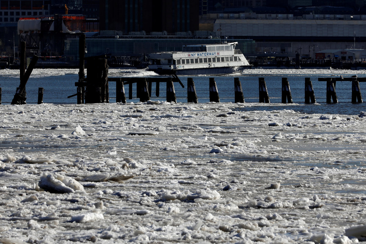 A New York Waterway Ferry navigates the Hudson River amid flows of ice between New Jersey and New York City, as seen from Weehawken, New Jersey, U.S., January 7, 2018. REUTERS/Mike Segar
