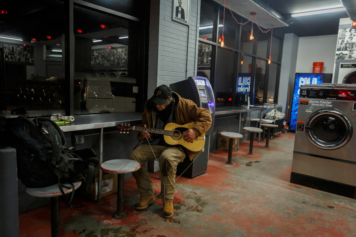 A homeless man, who gave his name as Spoons, plays guitar at a laundromat during the hours in which shelters are not open in Pittsburgh, Pennsylvania, U.S. January 7, 2018. Shelters are open between the hours of 7 p.m. and 7 a.m., forcing homeless individuals to spend their days moving from place to place to stay warm in the winter months. Picture taken January 7, 2018. REUTERS/Maranie Staab