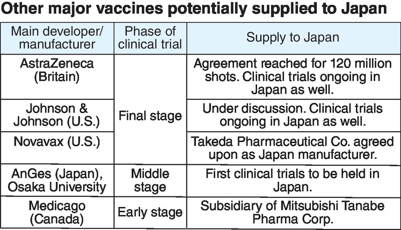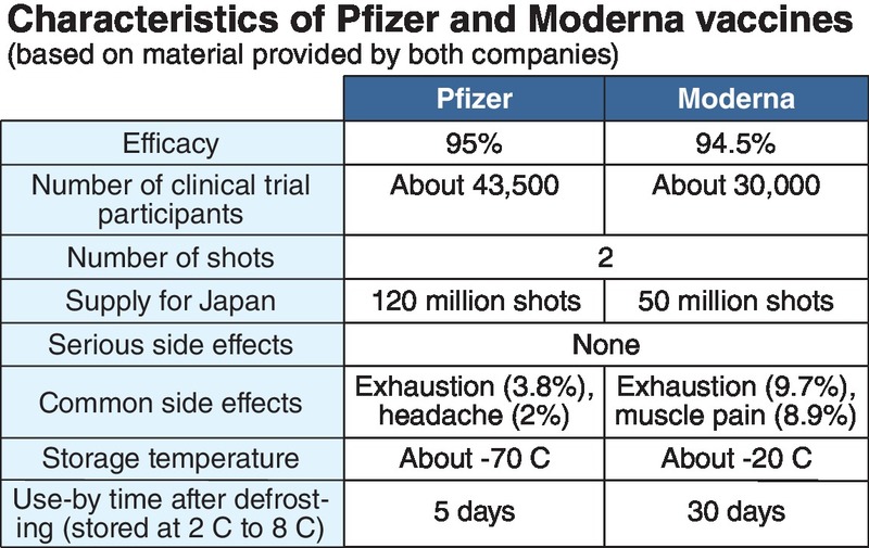 Both companies' vaccines involved two doses given about three or four weeks apart. After receiving the second jab, the proportion of people who felt lethargic or complained of muscle pain ranged from about 2% up to about 10%. Although no severe side effects were reported, University of Tokyo Prof. Ken Ishii warned about getting complacent.