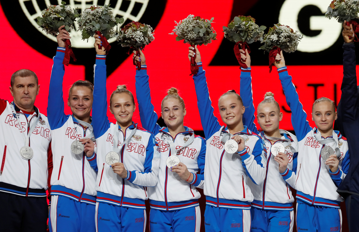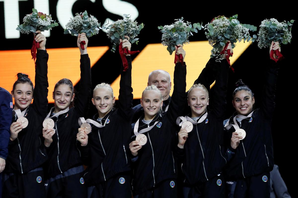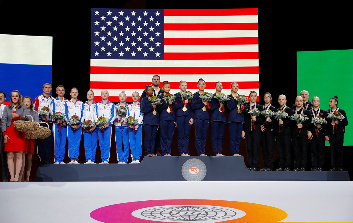 Italy (164.796) took third spot for its first world team medal since 1950, while China slipped off the podium for the first time since 2003.