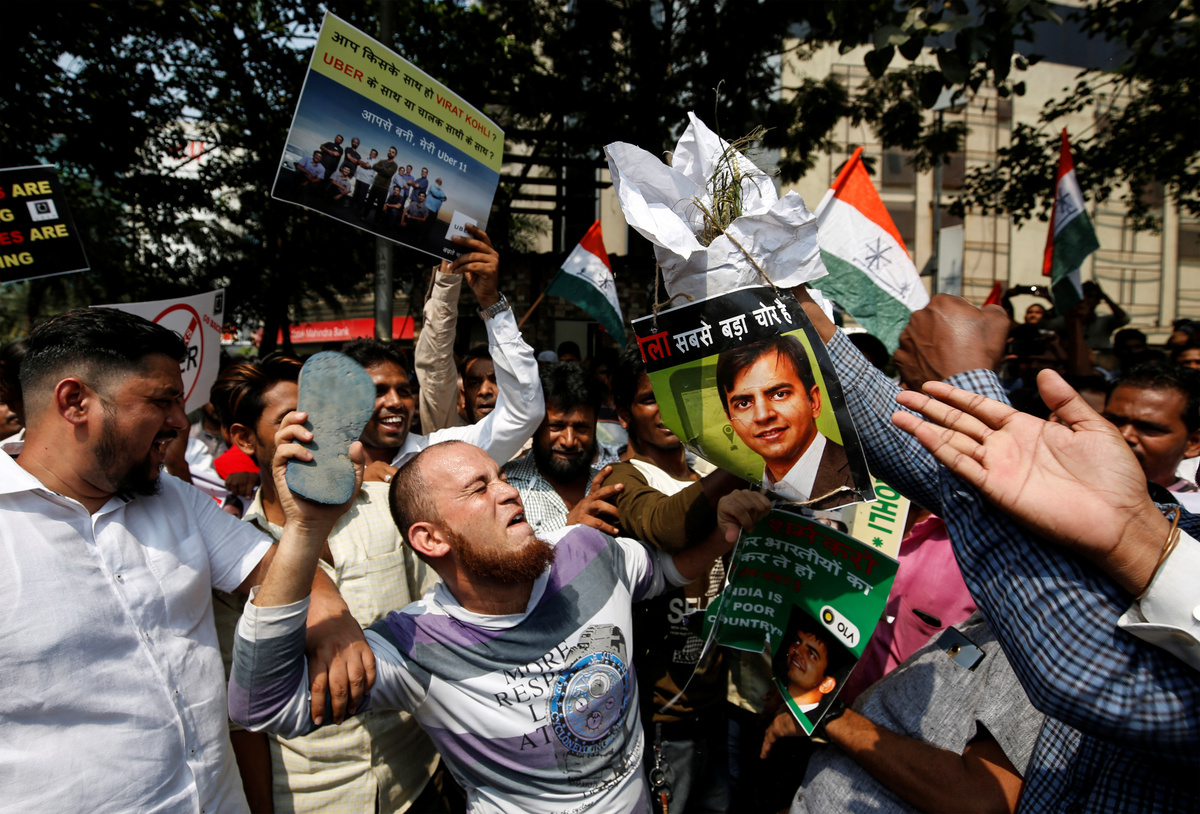 One protestor was seen angrily beating a poster of Ola's founder Bhavish Aggarwal with a flip-flop. Some drivers who were still ferrying passengers were pulled up by protesters and asked to stop working, the witness said.