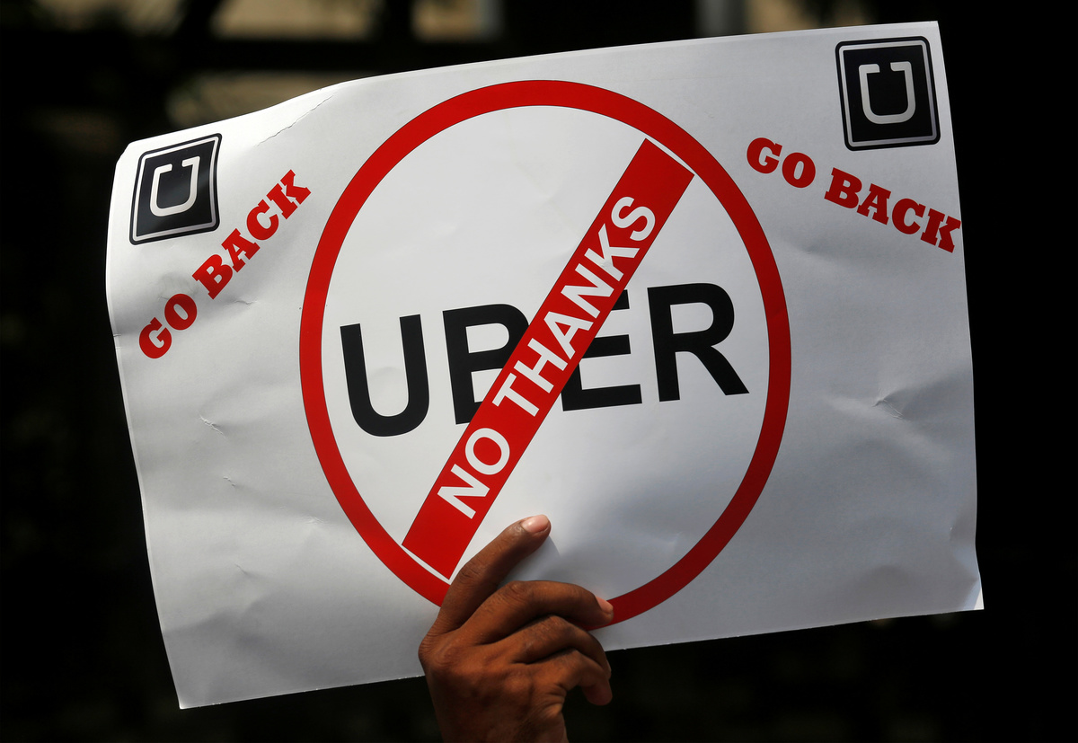 At a protest outside Uber's office in Mumbai, dozens of drivers held up placards with messages including "Uber go back" and "Ola is the biggest thief" while shouting slogans like "down with Uber", according to a Reuters witness.