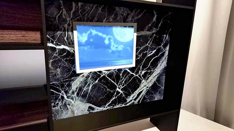 Their exhibit featured living room wall panels made using liquid crystal displays that enable users to change the color of the panels to mimic marble or wood finishes. The feature allows people to decorate their homes according to the atmosphere of the room or their feelings. The exhibit also included a lamp with motion-detection that only illuminates areas where it detects movement. Such a feature would allow, for example, people to go to the bathroom in the middle of the night without disturbing their family's sleep.