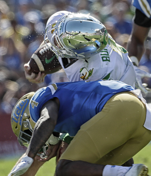 Defensive back Colin Samuel intercepted a pass at the UCLA four-yard line and safety Jaleel Wadood forced a fumble for the Bruins' sixth and seventh takeaways of the season. UCLA also sacked Oregon quarterback Braxton Burmeister four times after having zero sacks in its previous three games.