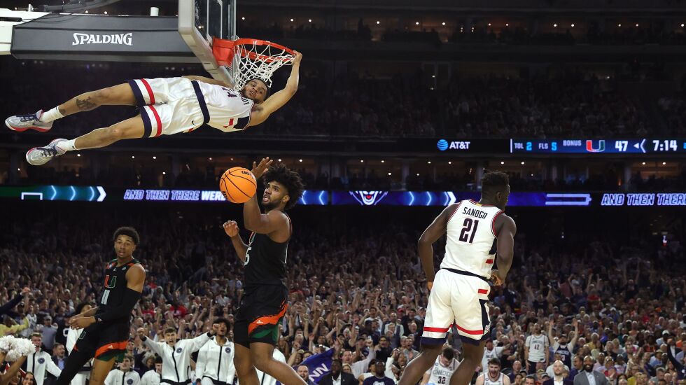 Isaiah Wong led the ’Canes with 15 points on 4-for-10 shooting. Harassed constantly by Sanogo, 7-foot-2 Donovan Clingan and the rest of Connecticut’s long-armed, rangy perimeter players, Miami, which came in with the nation’s fifth-best offense, shot 25% in the first half and 33.3% for the game.