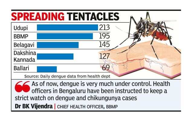 Dr BK Vijendra, chief health officer, BBMP, said the Palike is monitoring dengue cases and preventive modalities. “As of now, dengue is very much under control. Health officers in the city limits have been instructed to keep a watch on dengue and chikungunya,” he said. BBMP accounts for 15% of the total dengue cases in the state.