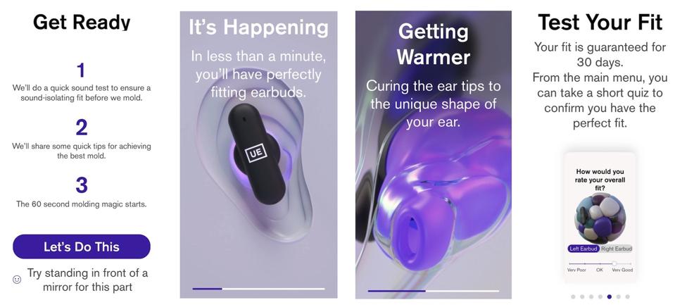 Download the UE FITS app, which walks you through the basics of connecting the earbuds. It’s pretty straightforward Bluetooth stuff. The FITS use Bluetooth 5.0 with SBC, AAC and APT-X support. Once connected the app will take you through the customization process step by step. It takes about 60 seconds. You are instructed in how how to position the earbuds for optimal audio performance, then built-in LED lights begin to warm up the malleable inner material so the buds conform to the shape of your ear canal. They get a little warm, but the app keeps you updated on progress.