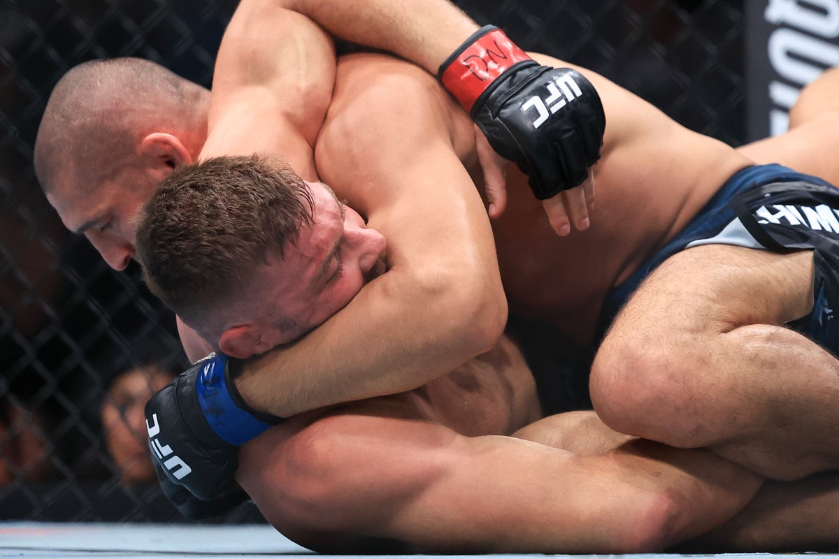 Now Chimaev eyes an arm-triangle choke, but DDP holds on tight to limit the Russian’s range of motion.