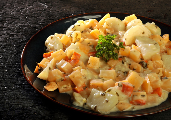 This is a hearty dish, a vegetable stew with a spectacular twist. You simmer together turnips, rutabagas, onion, garlic and a carrot, plus thyme for flavor, salt for seasoning and a bit of flour to thicken the sauce.