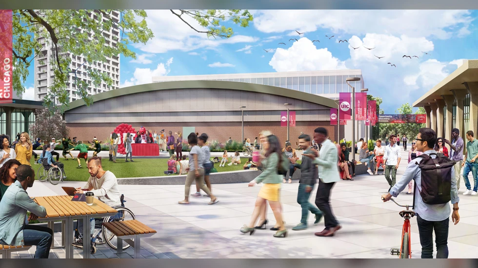 A 2018 UIC master plan calls for tearing up the paving stones on the East Campus quad and replacing them with grass — creating an “invigorating heart of student life.”