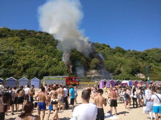 In Bournemouth a fire broke out at the city’s crowded beach on Saturday afternoon, with sunbathers watching on as crews tackled burning bushes. It was not immediately clear what had caused the blaze.