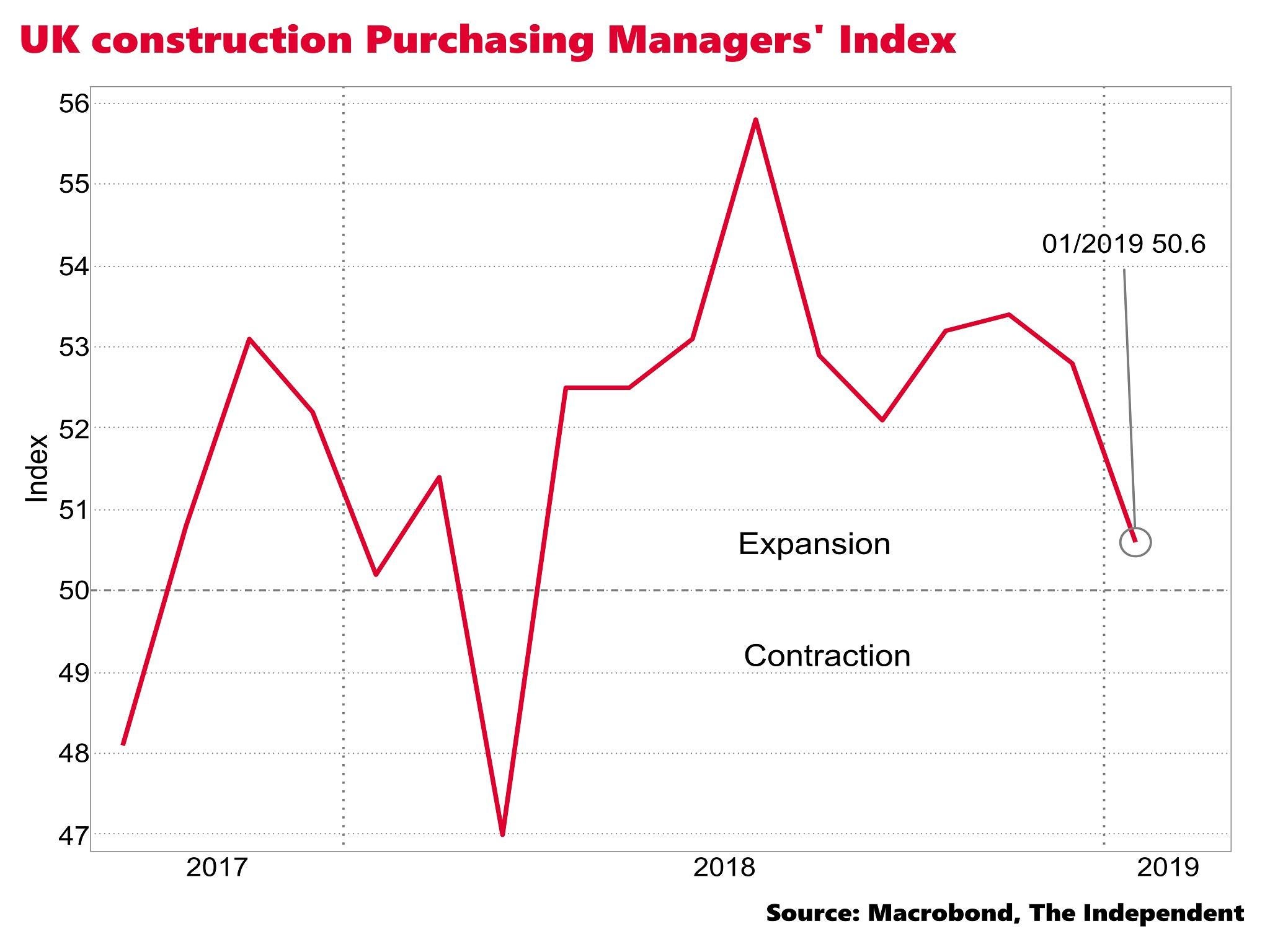 The most recent official data showed construction grew at a quarterly rate of 2.1 per cent in November 2018, as the sector caught up on delayed work from the spring, but the survey evidence suggests a major slowdown since then.