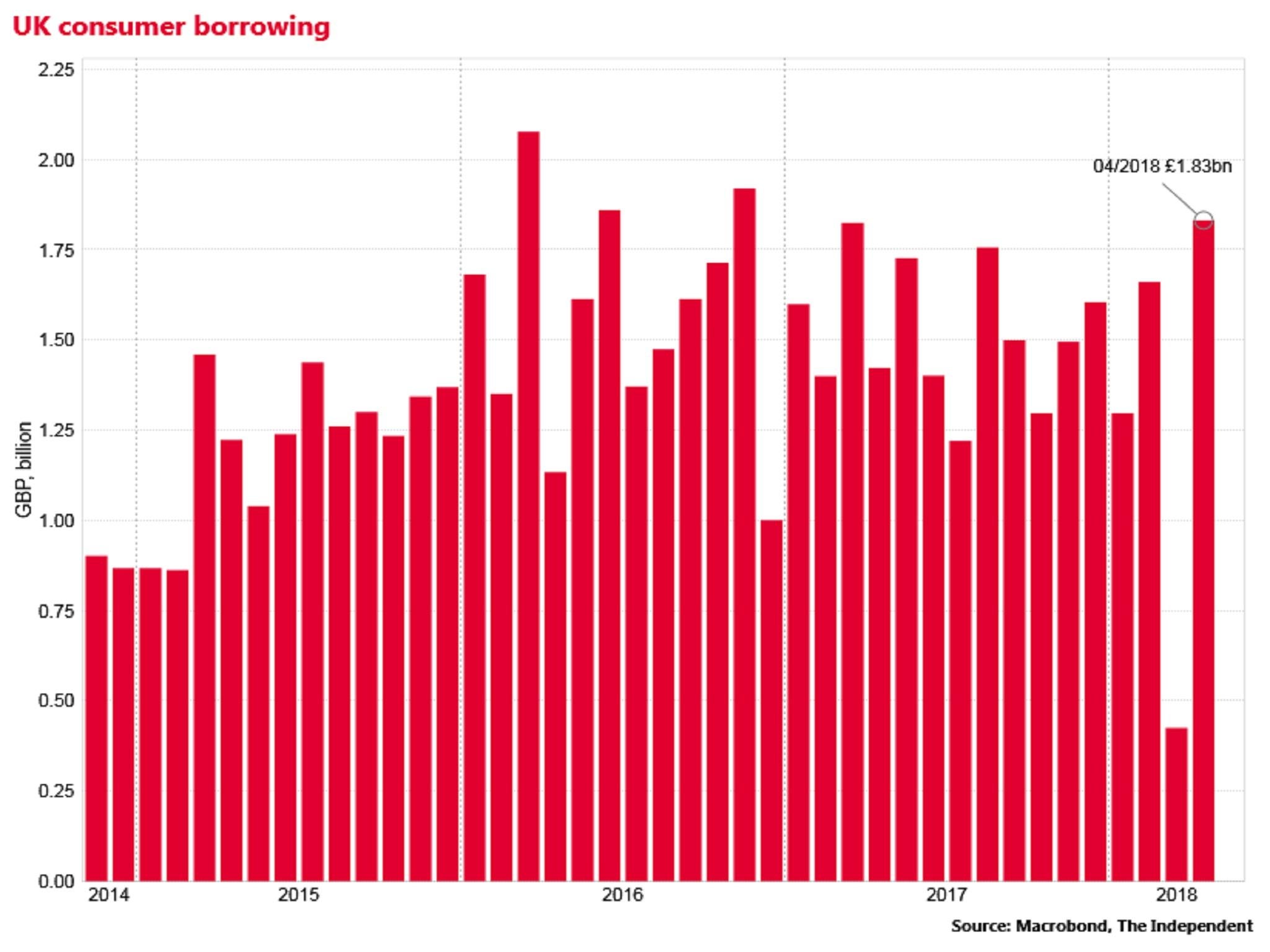 The bank reported on Thursday that consumer credit expanded by £1.83bn, up sharply from the £425m figure in March, when the Beast from the East deterred shoppers.