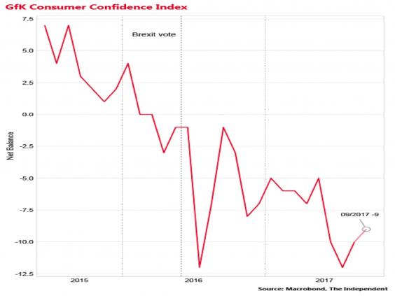 Consumer confidence picked up slightly in September, but remains close to the lows hit in the wake of the June 2016 Brexit vote, according to the latest snapshot of UK sentiment.